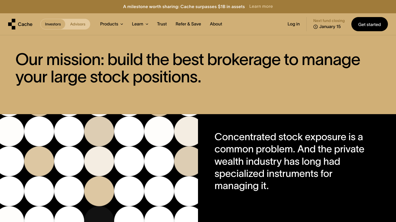 Cacheは大口株式ポジションの管理に特化した、現代的な証券ブローカーサービスです。